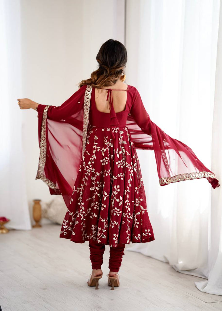 Aaradhya’s Regal Ruby Embroidered Ensemble Anarkali with Graceful Dupatta